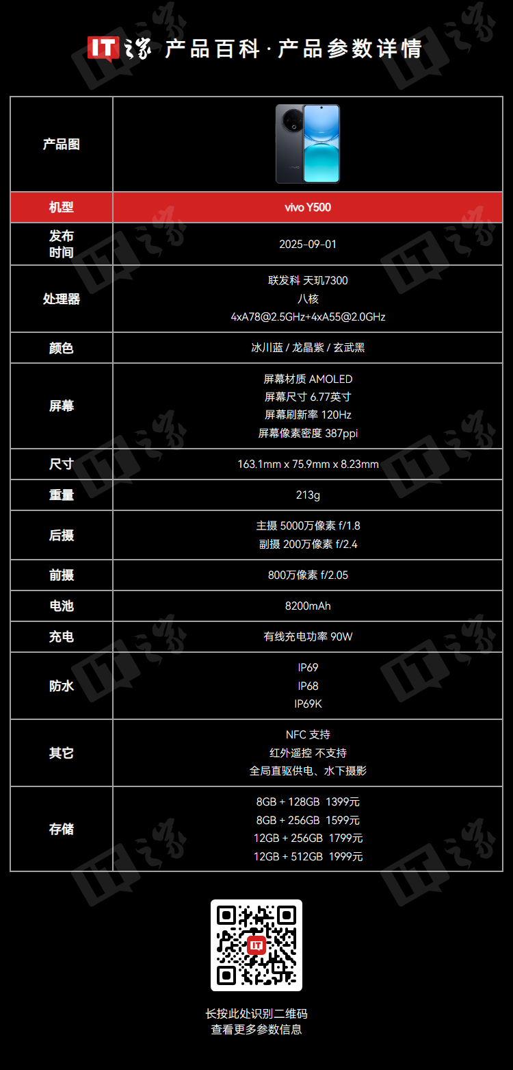 IT之家 9 月 5 日消息,vivo Y500 正式开售,官方定价 1399 元起,国补价 1189 元起,首销期间购机还将赠送价值 800 元的权益,包括 4 年电池宝、1 年进水宝、全能守护礼盒、vivo 会员新机礼包等。