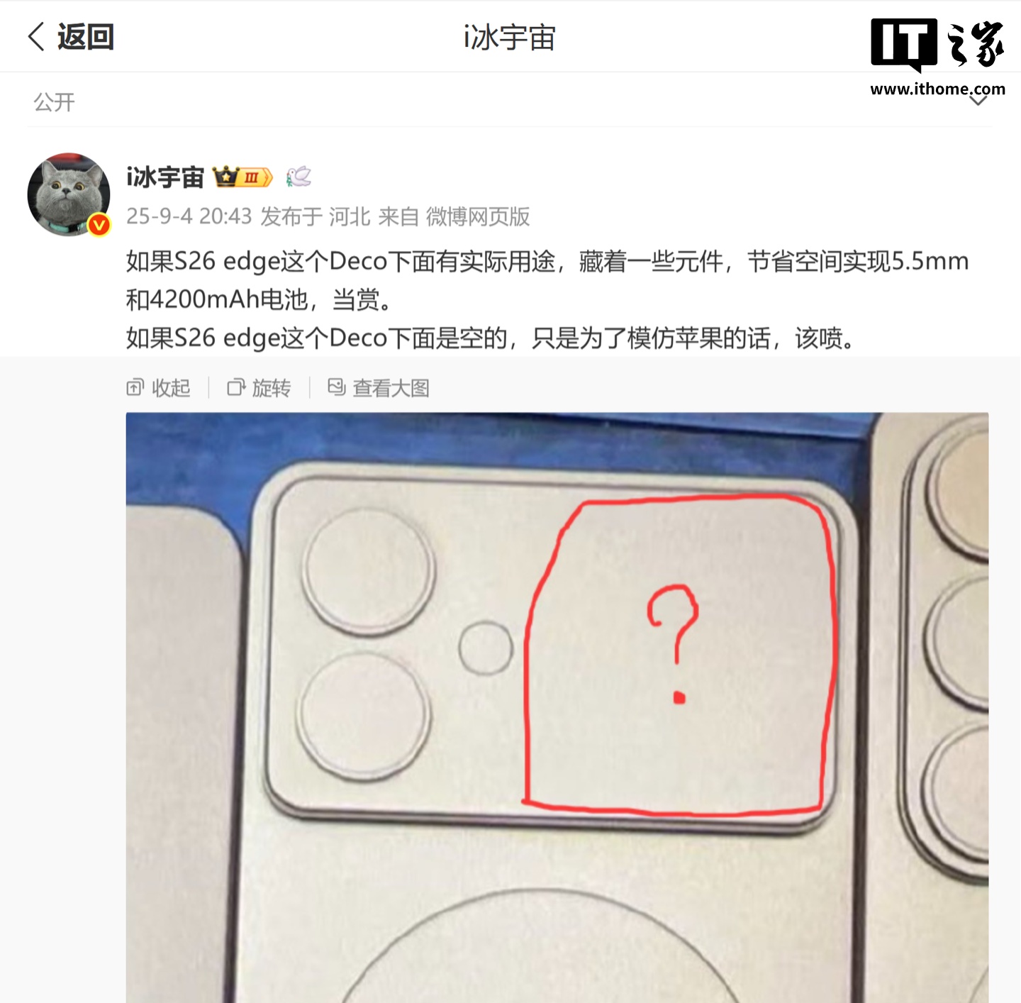如果 S26 edge 这个 Deco 下面有实际用途,藏着一些元件,节省空间实现 5.5mm 和 4200mAh 电池,当赏。