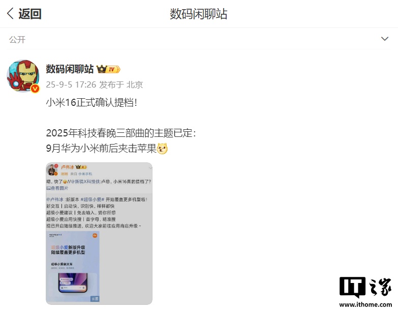 小米 16 正式确认提档,消息称 9 月华为小米前后夹击苹果