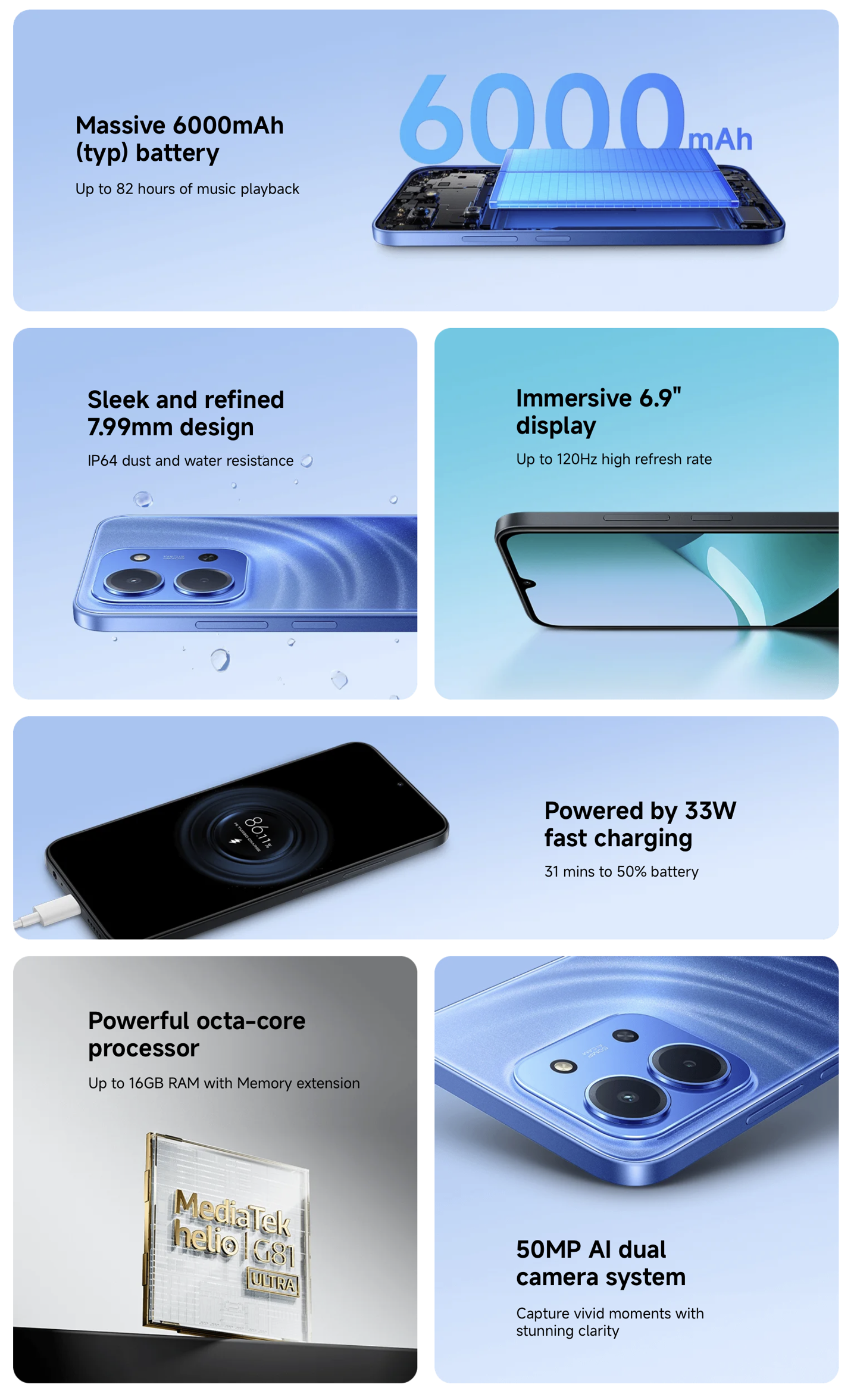 性能方面,该机搭载联发科 G81-Ultra 处理器,提供 4/6GB LPDDR4X RAM 和 128/256GB eMMC 5.1 存储,机身内置 6000 毫安时电池,支持 33W 有线充电。