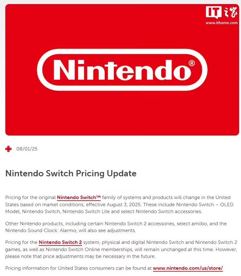 IT之家 8 月 2 日消息,当地时间周五(8 月 1 日),任天堂在官网发布声明,宣布将上调美国地区 Switch 系列产品的定价,调整将于 8 月 3 日正式生效。