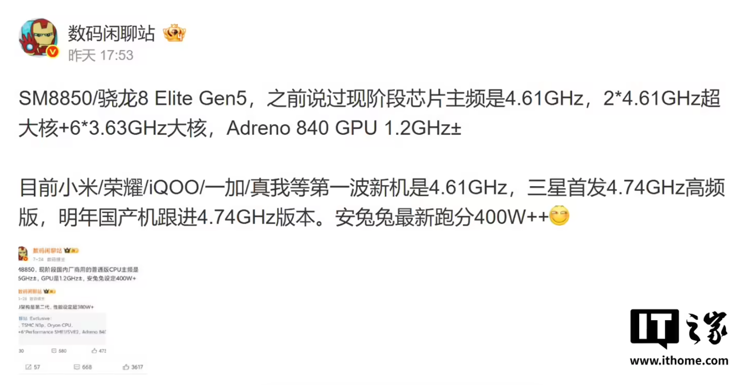 首先是 CPU 部分,根据目前已经掌握的信息,骁龙 8 Elite Gen5 将延续“2 超大核 + 6 大核”的八核心设计,但主频与架构优化显著。据数码博主 @数码闲聊站爆料,该芯片的 2 个性能核心时钟频率达 4.61GHz,6 个能效核心时钟频率为 3.63GHz,而三星还将通过独家协议推出高配版,主频进一步提升至 4.74GHz,国内手机品牌将于明年跟进这一版本。