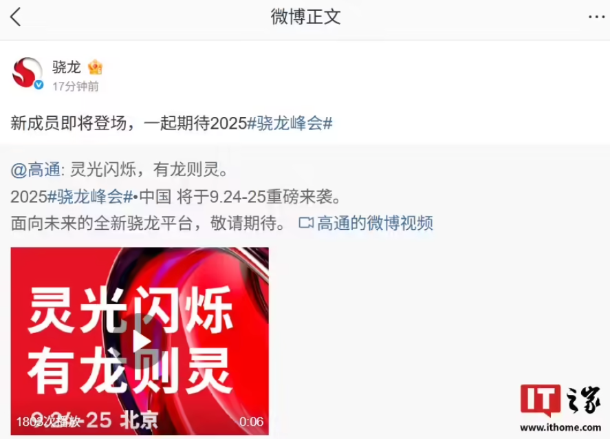 9 月 8 日,Qualcomm 高通官方微博正式官宣,2025 骁龙峰会・中国将于 9 月 24 日 – 25 日在北京举办,在微博文案中,官方表示“面向未来的全新骁龙平台,敬请期待”。