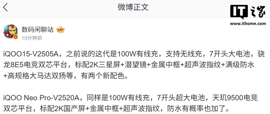 V2520A:对应 iQOO Neo Pro,同样支持 100W 有线充,拥有 7 开头大电池,搭载天玑 9500 处理器,标配 2K 国产屏 + 金属中框 + 超声波指纹,“有概率加防水”。