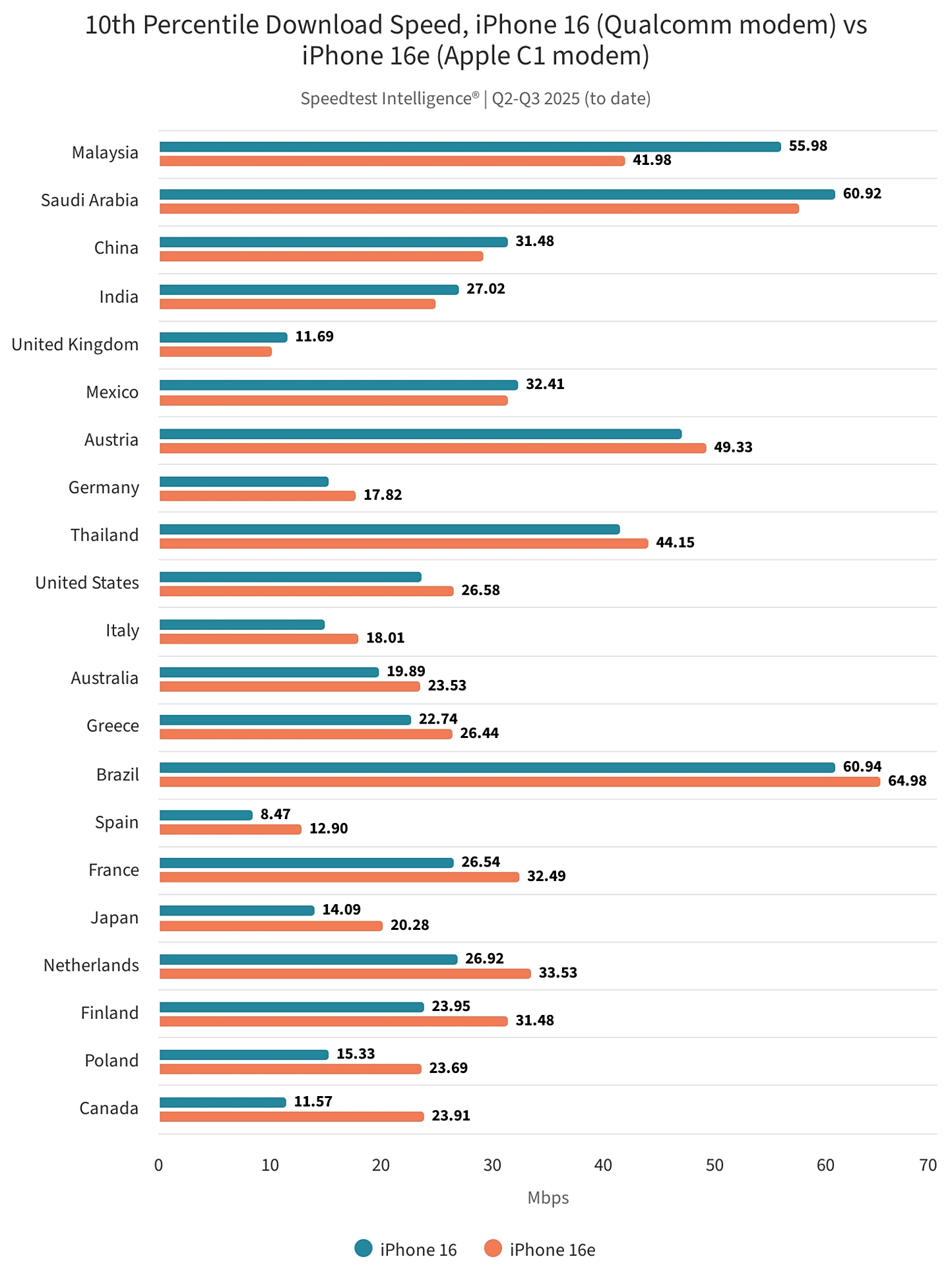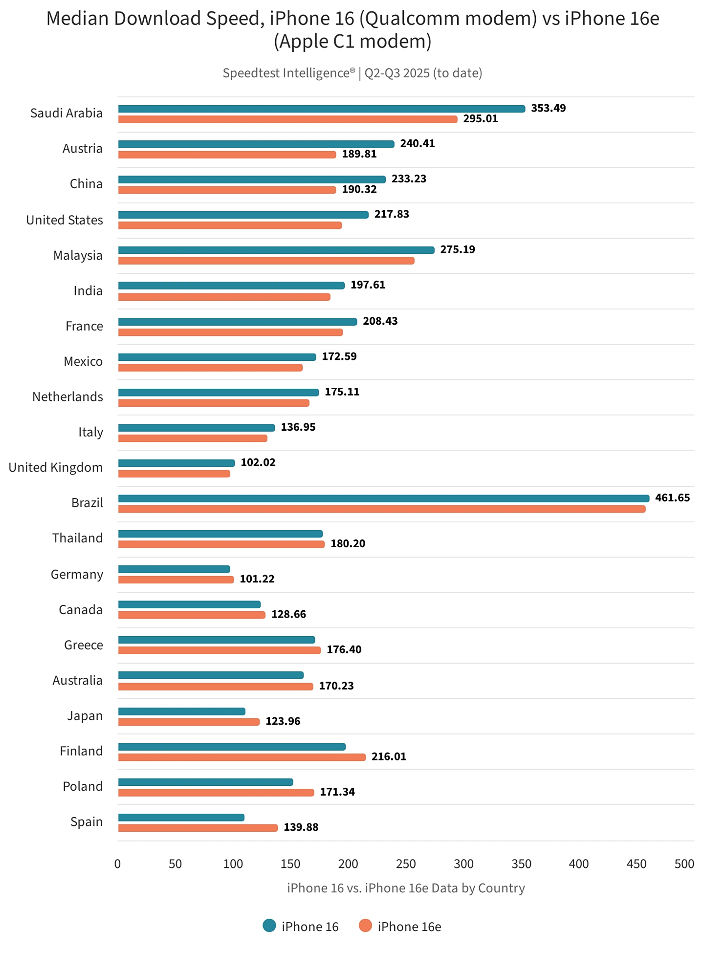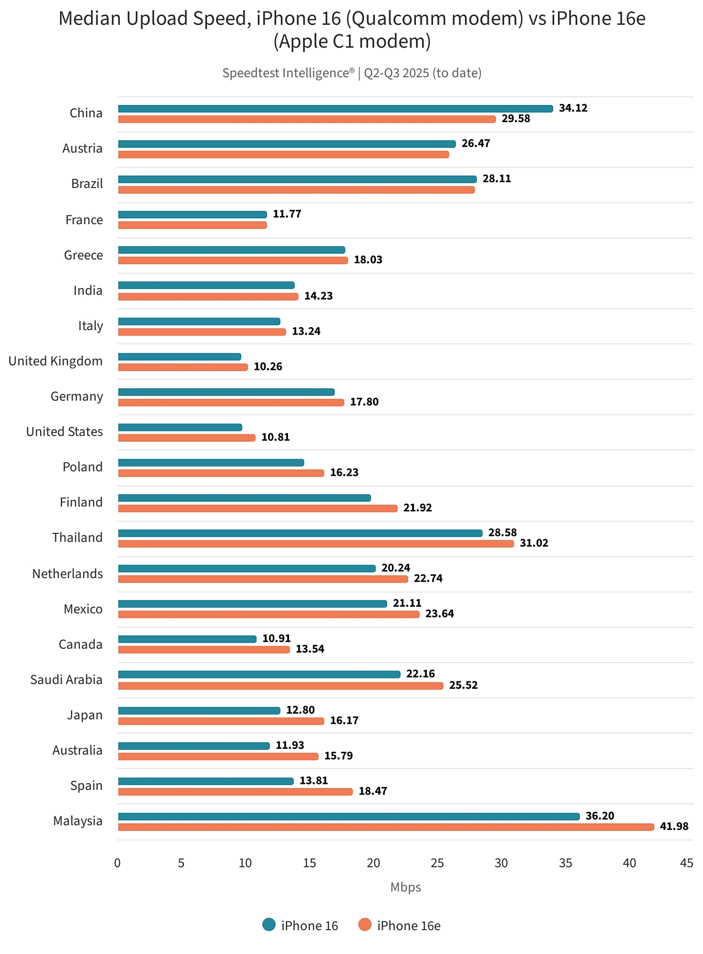 IT之家 9 月 9 日消息,第三方测速机构 Ookla 于 9 月 7 日发布博文,基于 2025 年第 2、第 3 季度 Speedtest 数据,报告称在全球 21 个市场,苹果首款搭载自研 C1 基带的 iPhone 16e 性能表现,与采用高通基带的 iPhone 16 各有优劣。