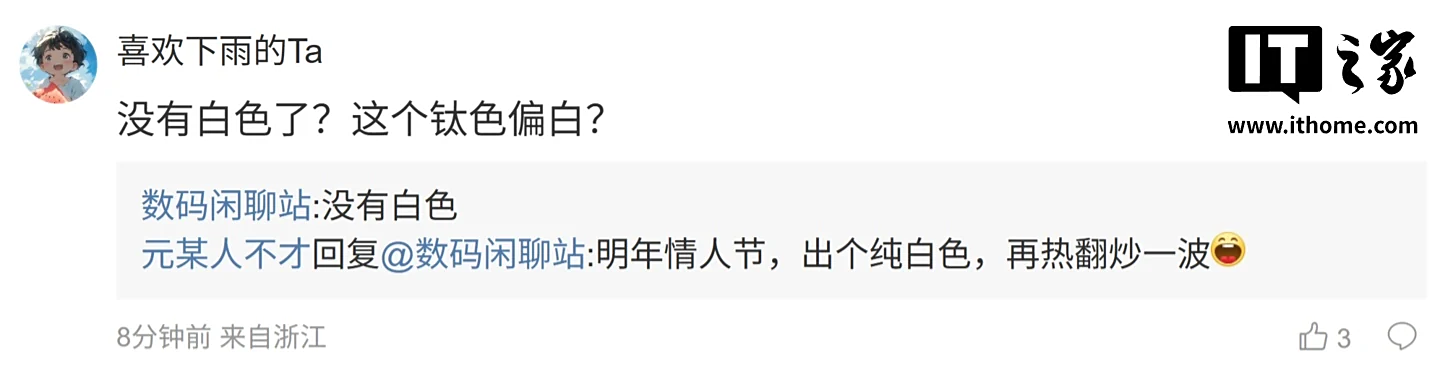 后续有用户在评论区询问:“没有白色了?这个钛色偏白?”,博主回复道:“没有白色”;另一名用户则询问道:“有点好奇明年的超大杯会到 230g 么?