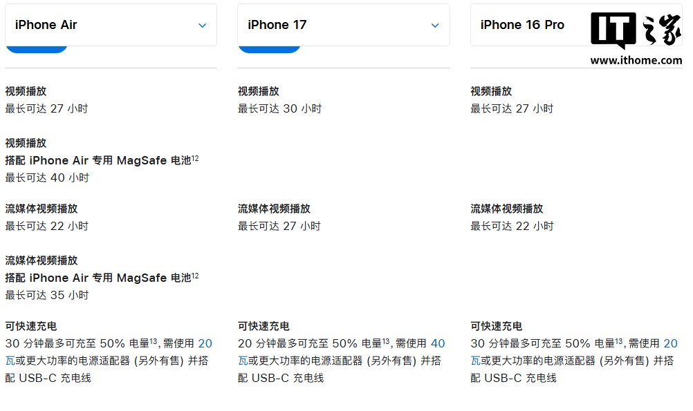 另外,苹果旗下最薄机型 iPhone Air 的 USB-C 充电速度与 iPhone 16 系列基本持平,需要 30 分钟才能充至 50% 电量,但它只有 3149 mAh 电池。