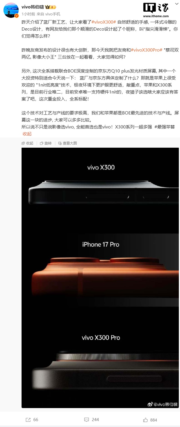 vivo 韩伯啸爆料 X300 系列手机:全系搭载京东方 Q10 plus 屏幕、安卓唯一硬件支持 1 尼特亮度