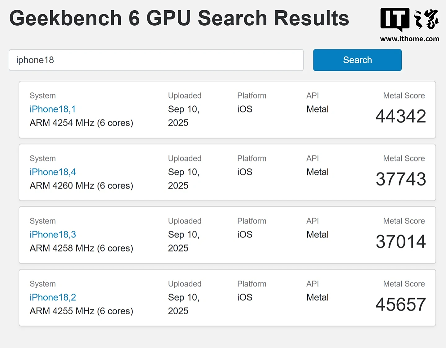 IT之家查询 GeekBench 跑分库,目前共有 iPhone18,1、iPhone18,2、iPhone18,3 和 iPhone18,4 四条记录,其中 iPhone18,2 的 Metal 跑分最高,为 45657 分;iPhone18,3 的 Metal 跑分最低,为 37014 分。