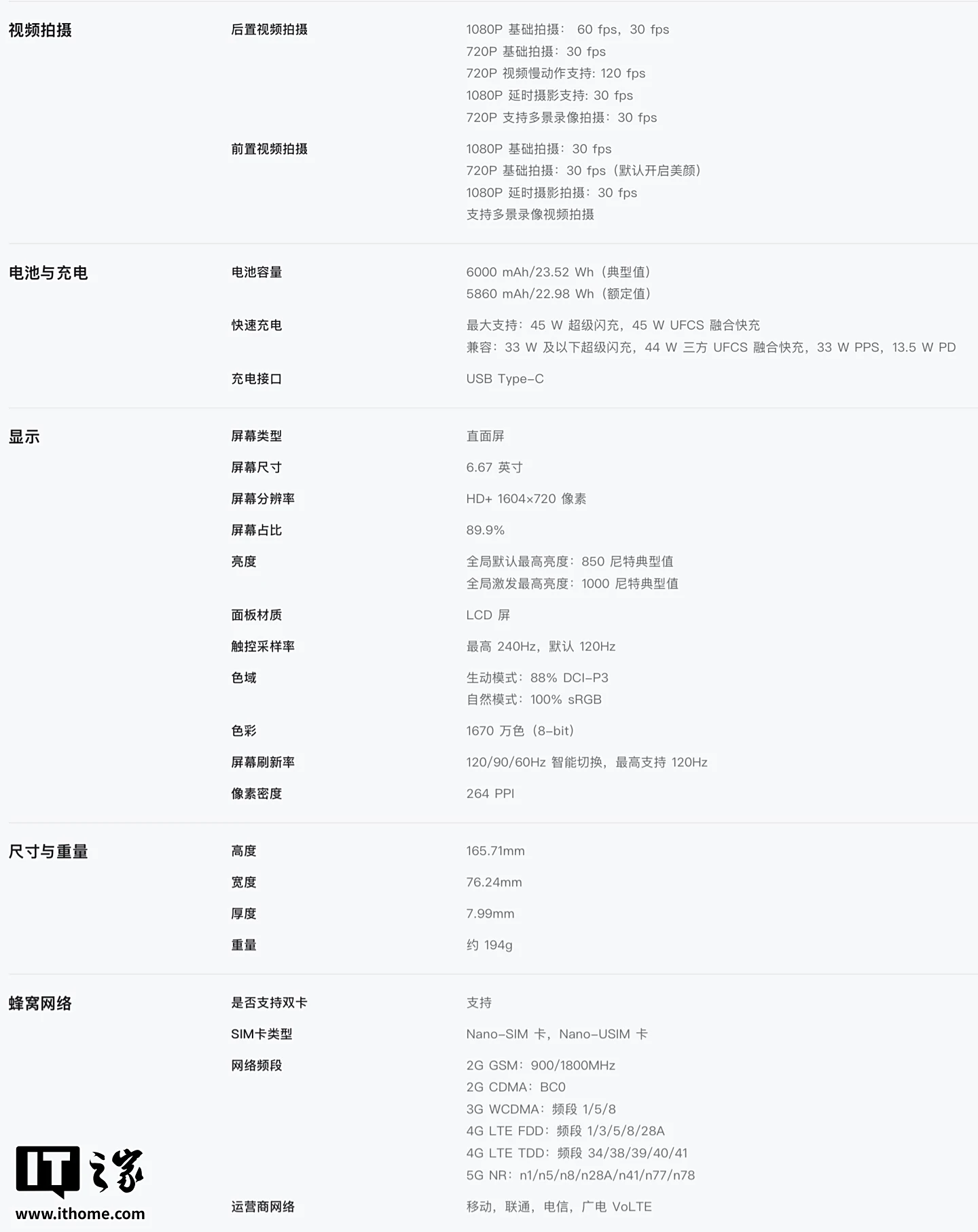 规格方面,该机搭载联发科天玑 6300 处理器,匹配 6/8GB LPDDR4X RAM 和 128/256GB UFS 2.2 存储,内置 6000 毫安时电池,支持 45W 有线充电。