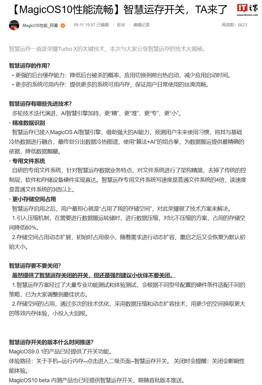 IT之家 9 月 14 日消息,荣耀性能优化研发工程师 @MagicOS性能_阿勇 发文称,MagicOS 系统的智慧运存开关已落地,已适配支持 10 Beta / 9.0.1 版本机型。