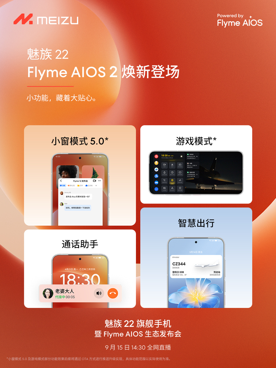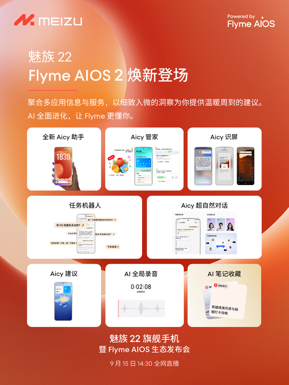 IT之家 9 月 14 日消息,魅族 22 旗舰手机暨 FlymeAIOS 生态发布会将于 9 月 15 日 14:30 举行,官方今日继续预热。