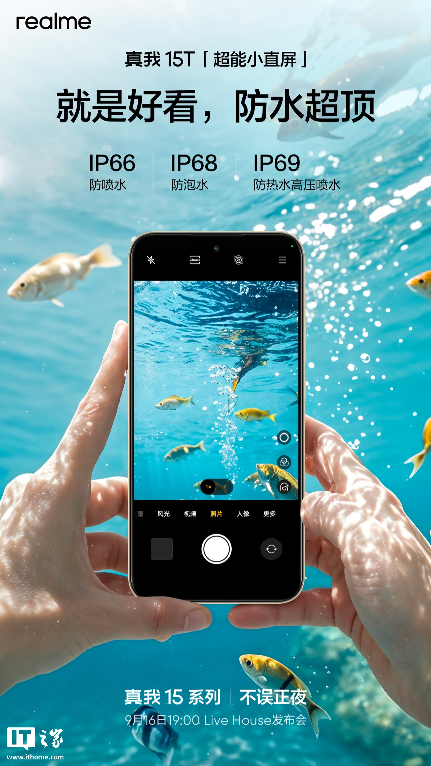 文章来源于互联网:真我 15T 手机宣称“不止颜值越级”:配备 4000nit 阳光屏,支持 IP69+IP68+IP66 满级防水