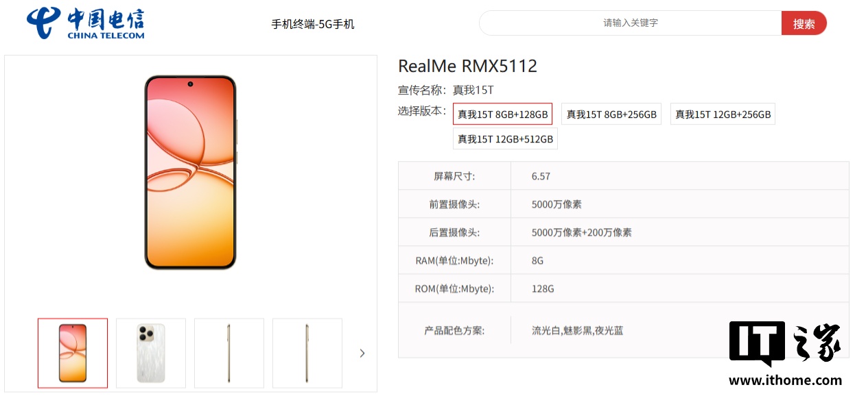 据IT之家昨日报道,型号为“RealMe RMX5112”的真我 15T 手机已现身中国电信终端产品库。该机提供 8GB+128GB、8GB+256GB、12GB+256GB、12GB+512GB 四种存储规格,拥有流光白、魅影黑、夜光蓝三种配色,产品零售价格未公布。