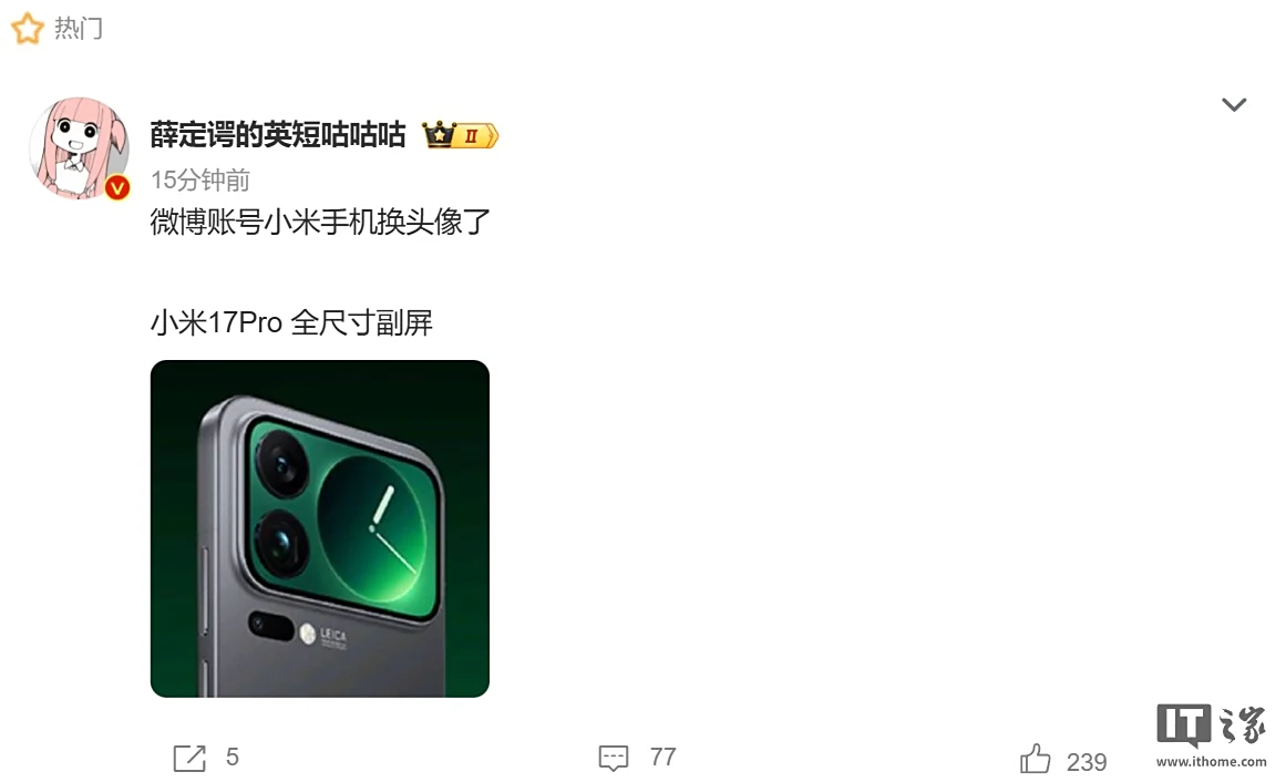 文章来源于互联网:小米手机官博头像意外泄露新机背屏,预计为 17 Pro 系列
