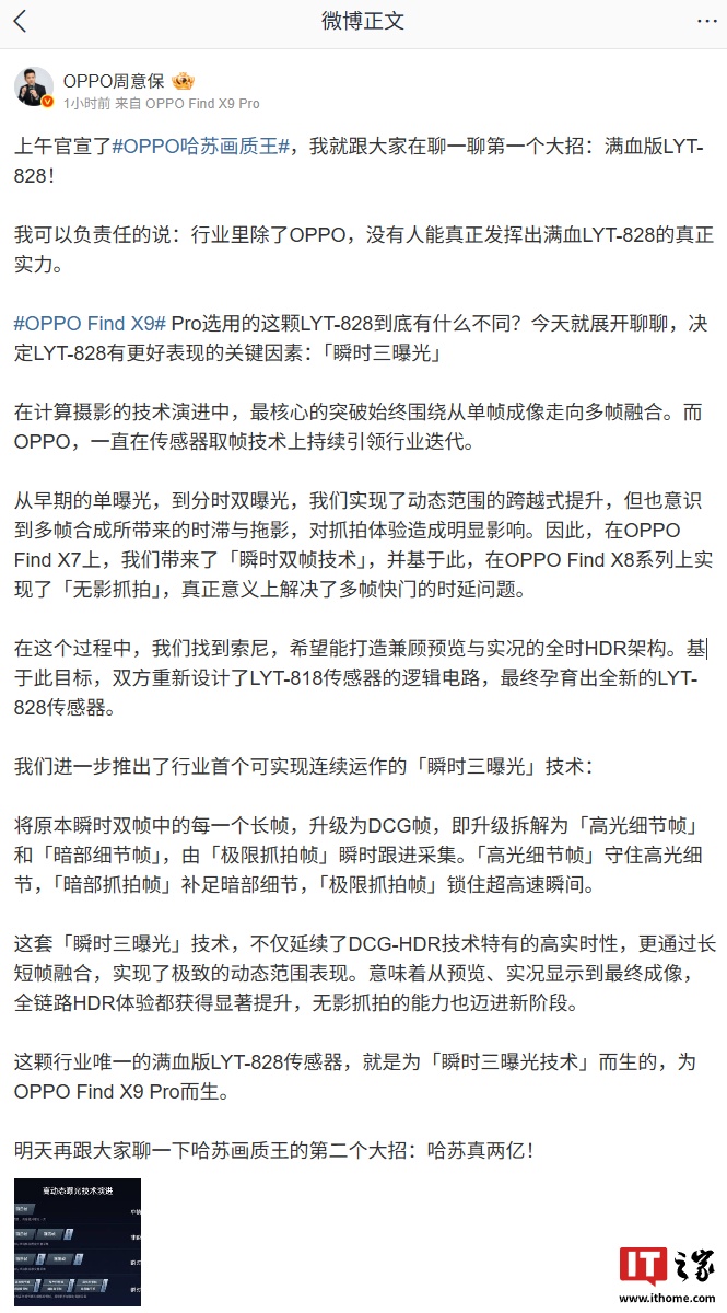 IT之家 9 月 15 日消息,OPPO Find 系列产品负责人周意保今日发文预热新机,并宣布 OPPO Find X9 Pro 手机搭载行业唯一满血版 LYT-828 传感器,将进一步推出了行业首个可实现连续运作的「瞬时三曝光」技术。