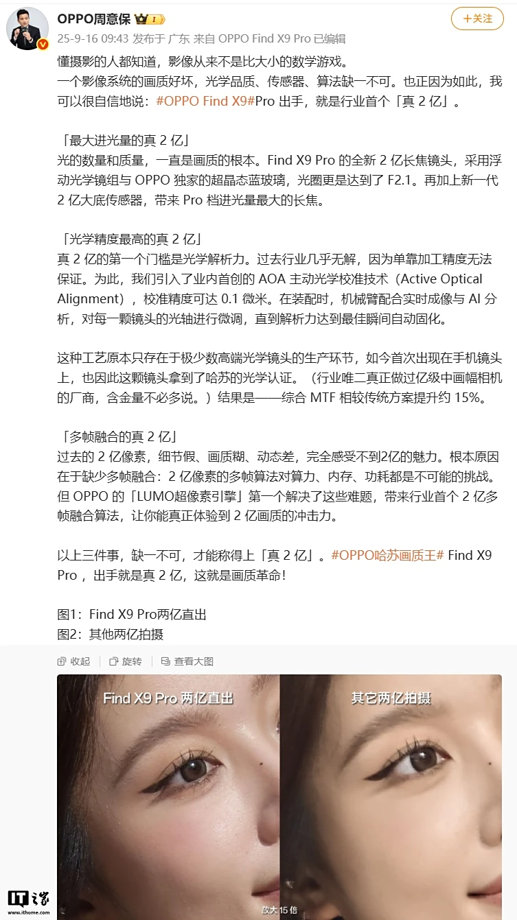 周意保认为,光学品质、传感器、算法直接影响了手机的画质好坏,OPPO Find X9 Pro 将是行业首个“真 2 亿”手机,这款手机采用浮动光学镜组与 OPPO 独家的超晶态蓝玻璃,光圈达到了 f/2.1,配合新一代 2 亿大底传感器,号称“Pro 档进光量最大的长焦”。
