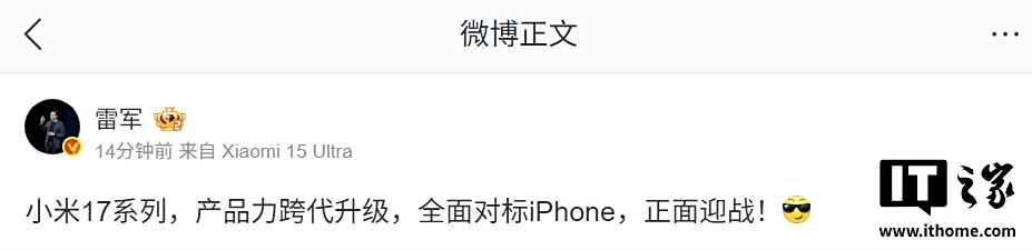 全新小米 17 系列手机官宣将于本月发布,小米创办人、董事长兼 CEO 雷军表示:小米 17 系列,产品力跨代升级,全面对标 iPhone,正面迎战!