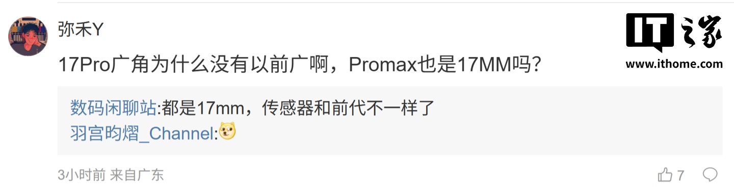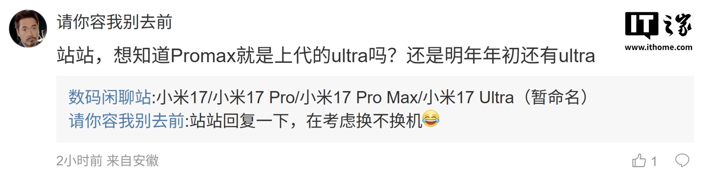 而另一名网友则表示:“站站,想知道 Promax 就是上代的 ultra 吗?还是明年年初还有 ultra”,博主则回复道:“小米 17 / 小米 17 Pro / 小米 17 Pro Max / 小米 17 Ultra(暂命名)”;另外一名用户则询问道:“17Pro 广角为什么没有以前广啊,Pro Max 也是 17mm 吗?”,博主则表示:“都是 17mm,传感器和前代不一样了”。