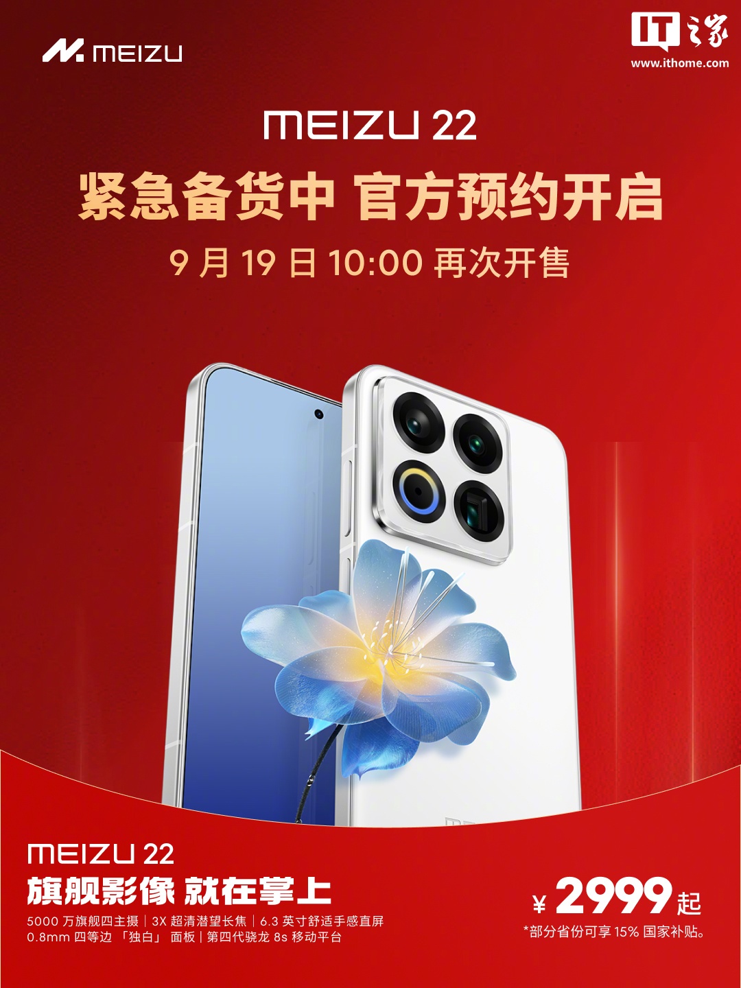 据IT之家今日早些时候报道,魅族科技官方向魅友进行致谢,并表示正在加大马力紧急备货中,即日起官方预约开启,将在 9 月 19 日 10:00 再次开售。官方称为了回馈大家对魅族 22 的支持,将 1 元超前订权益使用时间延长至 9 月 22 日,权益期间内购机仍可享 365 天只换不修、分期免息等八重权益。