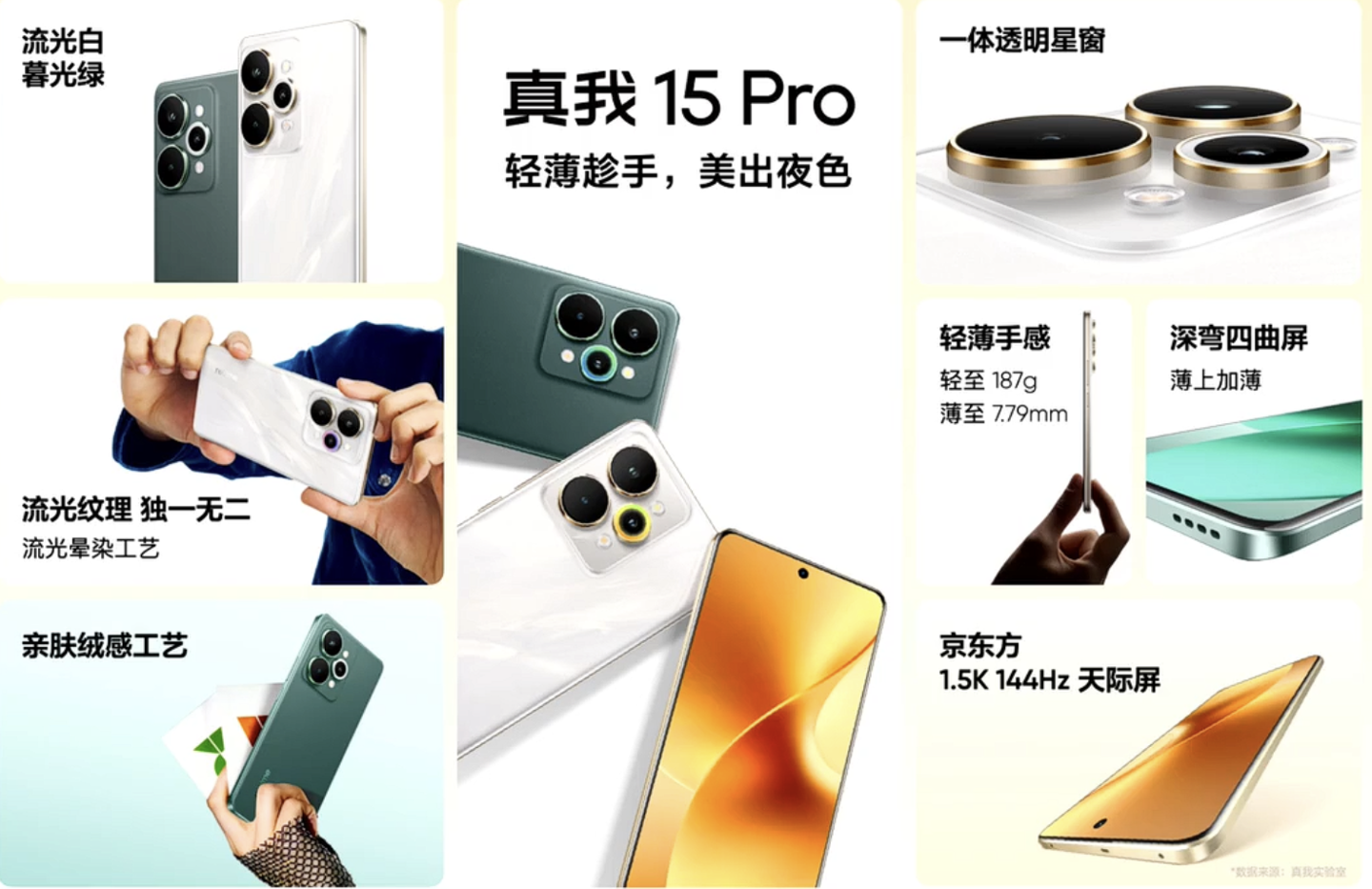 而在真我 15 Pro 方面,该机可选“流光白”和“暮光绿”配色,其中“流光白”配色首发流光晕染工艺,在不同光照下可呈现不同效果。机身整体重量 187 克,厚度 7.79 毫米。