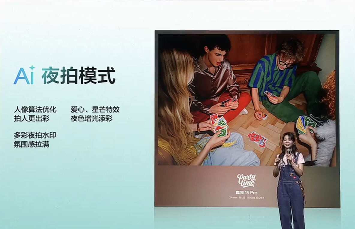 官方强调系列机型采用一体透明星窗后摄模组设计,配备觉醒光环系统,后置真我首款 AI 魔法双闪光灯,拥有“智慧双色温”特性,两个闪光灯可分别照出暖白光、亮白光,号称可“告别扁平暗光”。同时手机内置 AI 夜拍模式、派对水印、AI 派对模式、光效滤镜、LivePhoto 等功能。