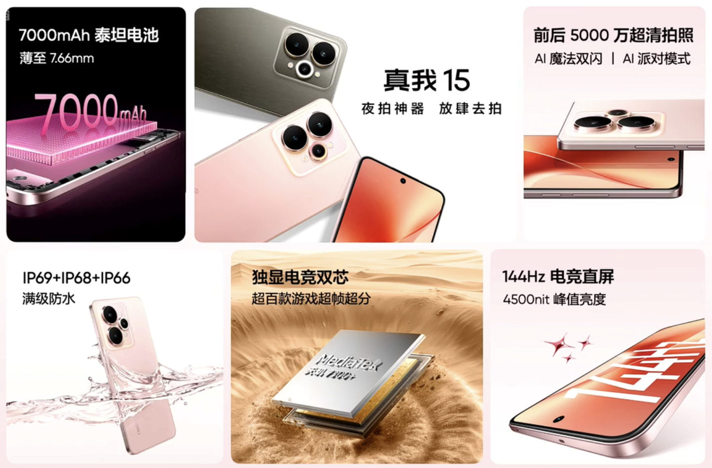 真我 15 可选“钛灰”和“樱粉”配色,整体重量 185 克,厚度 7.66 毫米。该机搭载一块 6.77 英寸 1.5K 144Hz 面板(局部峰值亮度 4500 尼特),匹配 50MP 自拍摄像头;手机后置 50MP IMX882 主摄 + 8MP 副摄。匹配天玑 7300 处理器,内置 7000 毫安时电池,支持 80W 充电,同时拥有 IP69 / IP68 / IP66 认证。