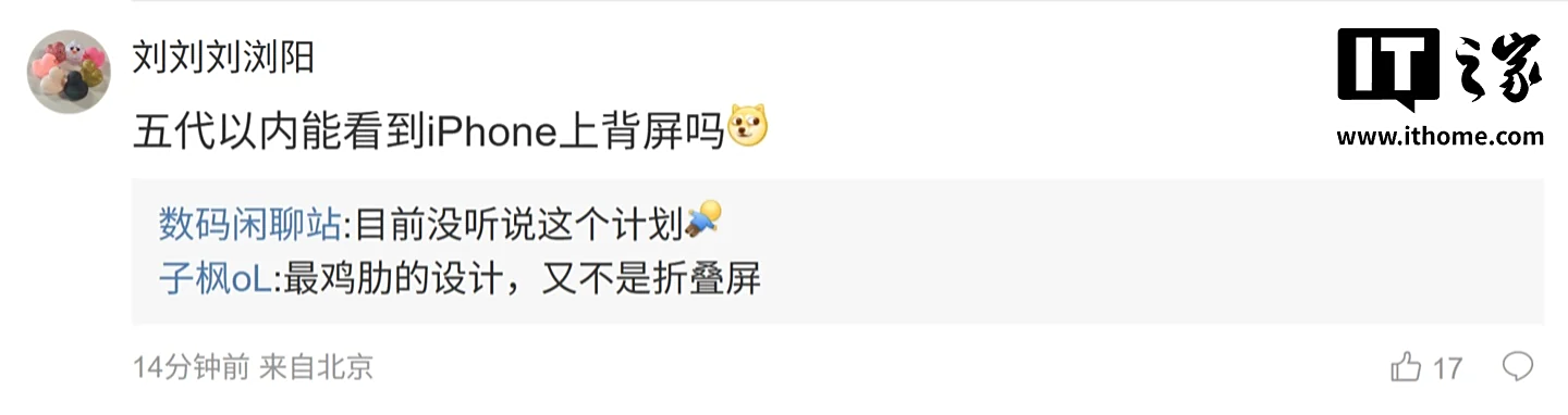 ”,博主回复道:“有的,目前产线规划连 18E 都存在,只是 18 标准版可能会延期登场”;另一名用户询问道:“五代以内能看到 iPhone 上背屏吗