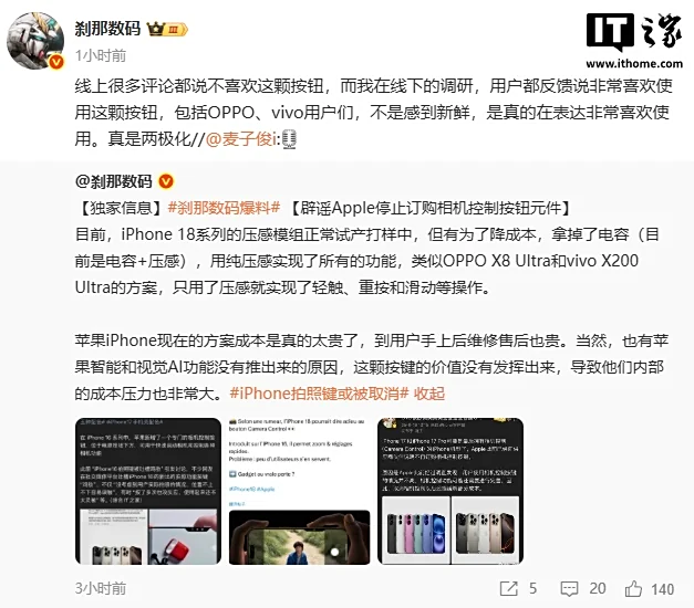 不过对此博主 @刹那数码 给出了不同的答案,他透露 iPhone 18 系列的压感模组正常试产打样中,拿掉了电容,纯靠压感实现以往的功能,形态类似 OPPO Find X8 Ultra。