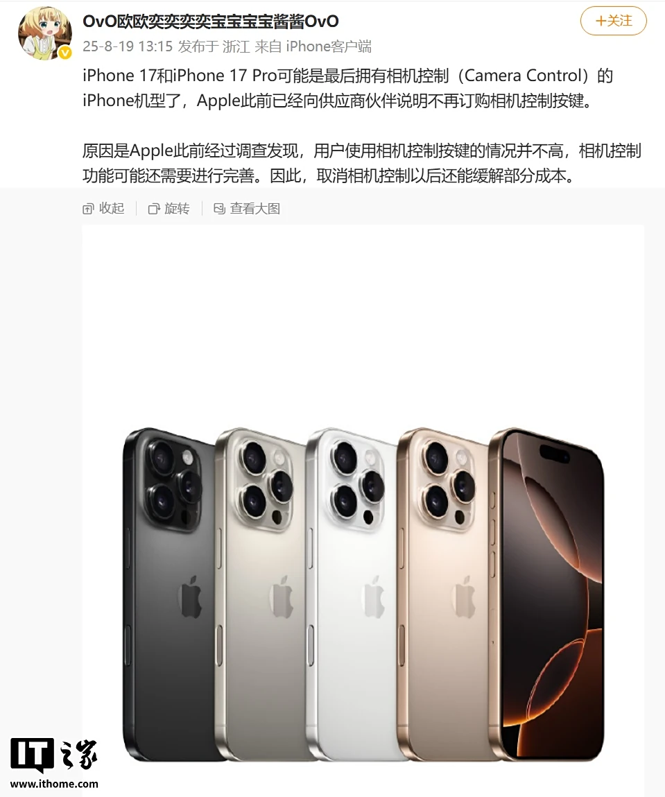 据IT之家此前报道,此前曾有消息人士爆料,苹果已经向供应商伙伴说明不再订购相机控制按键,因此 iPhone 17、iPhone 17 Pro 系列可能是最后拥有相机控制按键的 iPhone 机型。
