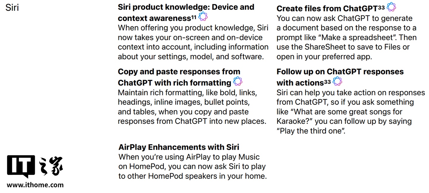 其次,苹果强化了 Siri 接入 ChatGPT 体验。在用户从 ChatGPT 复制回答后,Siri 现在可以保留原有的富文本格式,包括加粗、链接、标题、内嵌图片、项目符号以及表格。这让跨应用迁移内容更高效,减少了格式重排的麻烦。