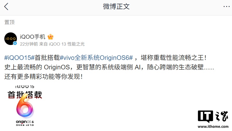 IT之家注意到,iQOO 手机官方微博今日也宣布:iQOO 15 首批搭载 vivo 全新系统 OriginOS 6,堪称重载性能流畅之王,新系统也是史上最流畅的 OriginOS。另外,iQOO 15 手机还支持更智慧的系统级端侧 AI、随心跨端的生态破壁等功能。