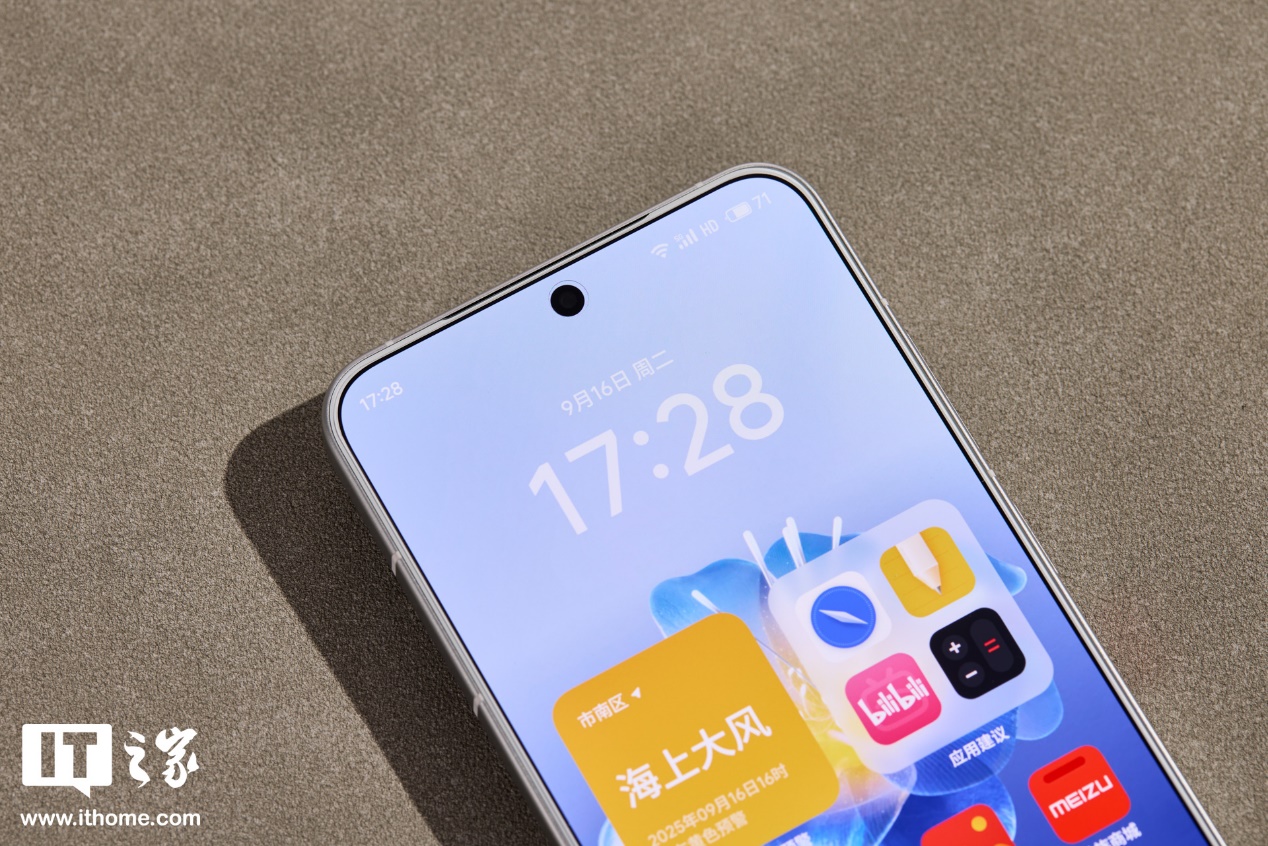 魅族 22 正面依旧采用了四等边白面板设计,边框宽度进一步缩窄到 1.2mm,物理面板宽度只有 0.8mm,保留居中小挖孔前置镜头,屏占比非常高。