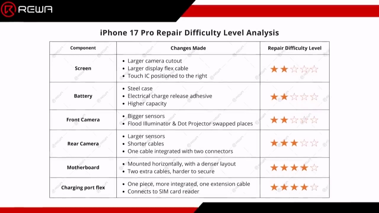 拆解过程显示,iPhone 17 Pro 减少了粘合剂的使用,内部使用了 14 颗螺丝,让零部件更易拆卸和更换,更利于维修。