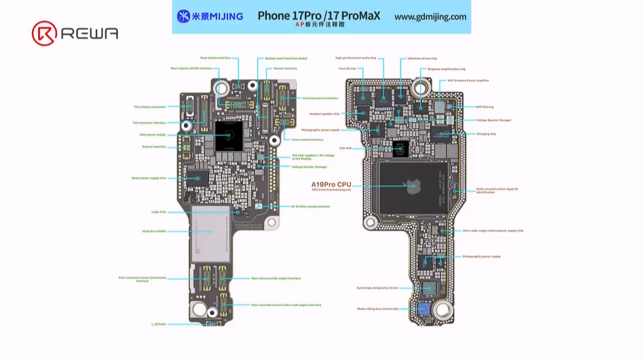 主板方面,新机的电路板更为紧凑,并采用水平布局。这种布局不仅节省空间,还可能提高抗摔能力。不过,拆解团队注意到,主板一侧的 NAND 闪存芯片位置与另一侧的 A19 芯片部分重叠,这在加热升级 NAND 存储时,存在损坏主芯片的风险。IT之家附上相关拆解截图如下: