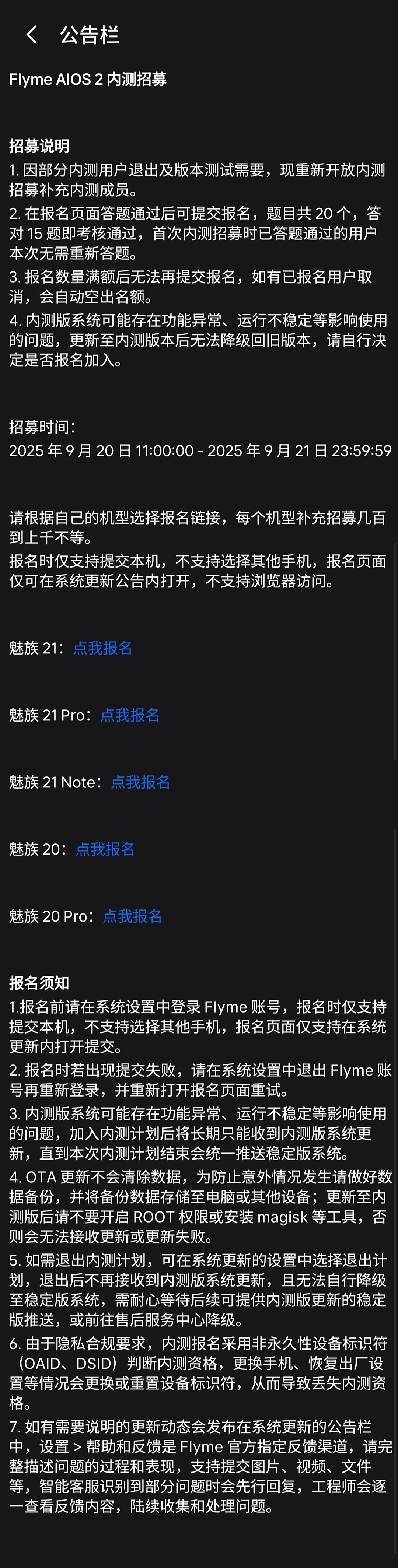 文章来源于互联网:魅族 20/21 系列重新开放 Flyme AIOS 2 内测招募,每款机型补充几百到上千人