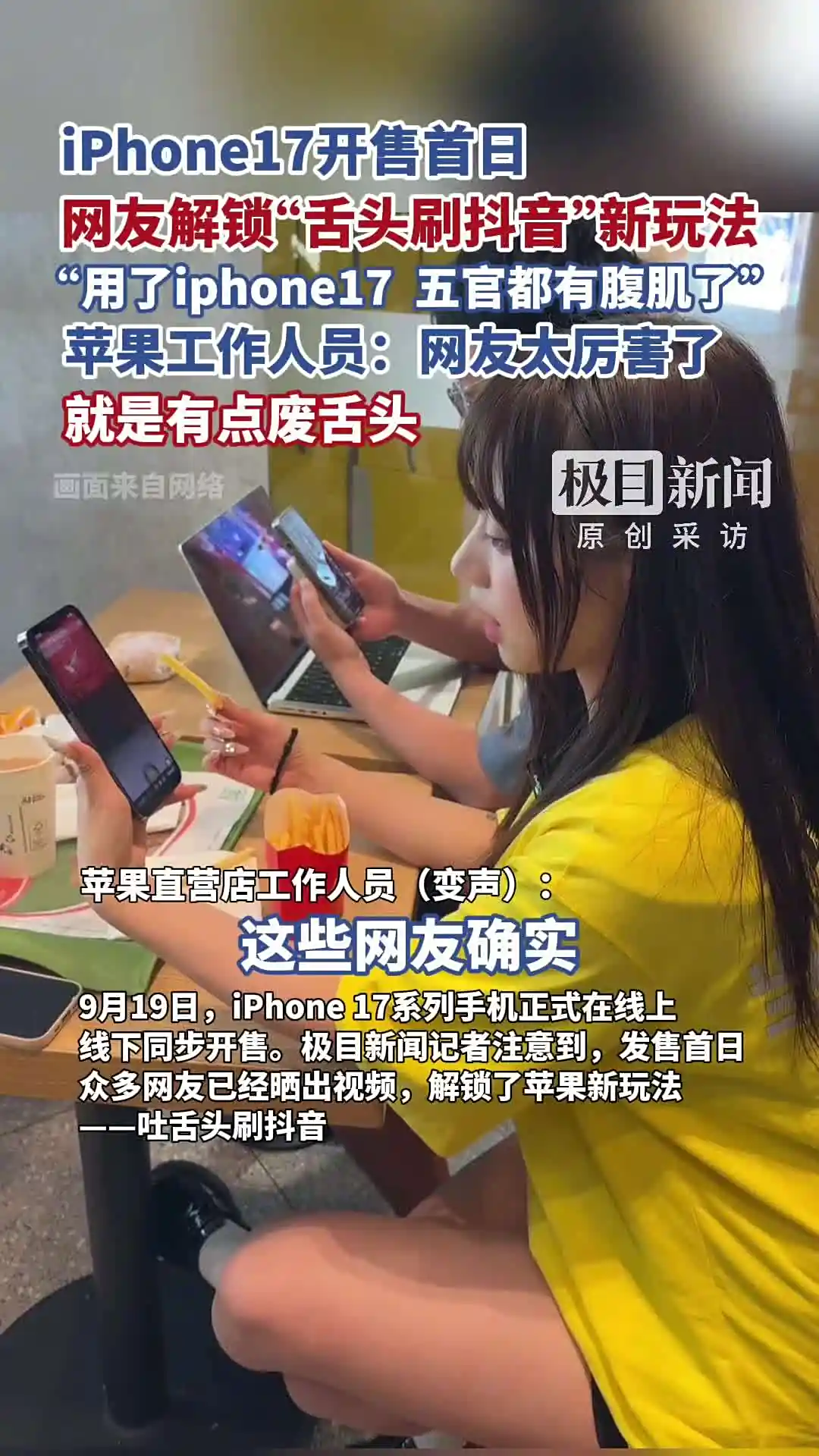 IT之家 9 月 20 日消息,@极目新闻 昨日(9 月 19 日)发布微博,报道称在苹果 iPhone 17 系列开售首日,众多网友已经晒出视频,解锁了苹果新玩法 —— 吐舌头刷抖音。视频显示,他们对着苹果手机屏幕,无需用手滑动,只需隔空吐一下舌头,就会翻到下一个视频。