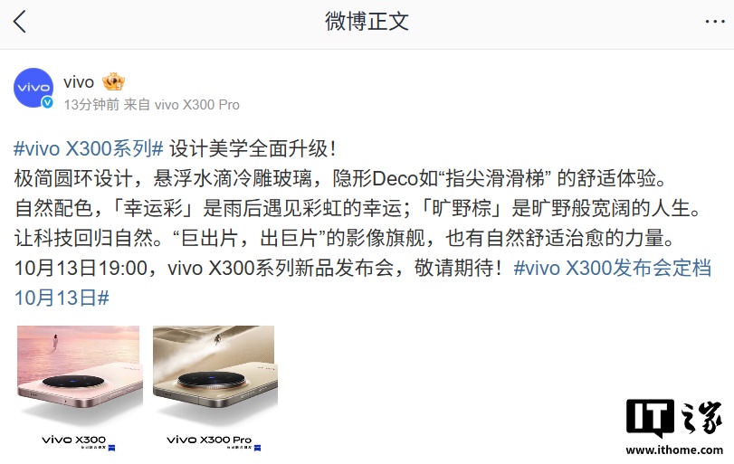 vivo X300 系列手机设计美学全面升级:极简圆环设计 + 悬浮水滴冷雕玻璃,10 月 13 日发布