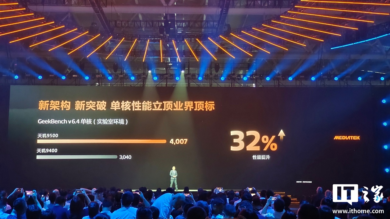 IT之家从发布会现场获悉,天玑 9500 宣称是安卓处理器单核性能首次比肩苹果当代旗舰,GeekBench 单核跑分 4007,相比上一代天玑 9400 提升 32%。