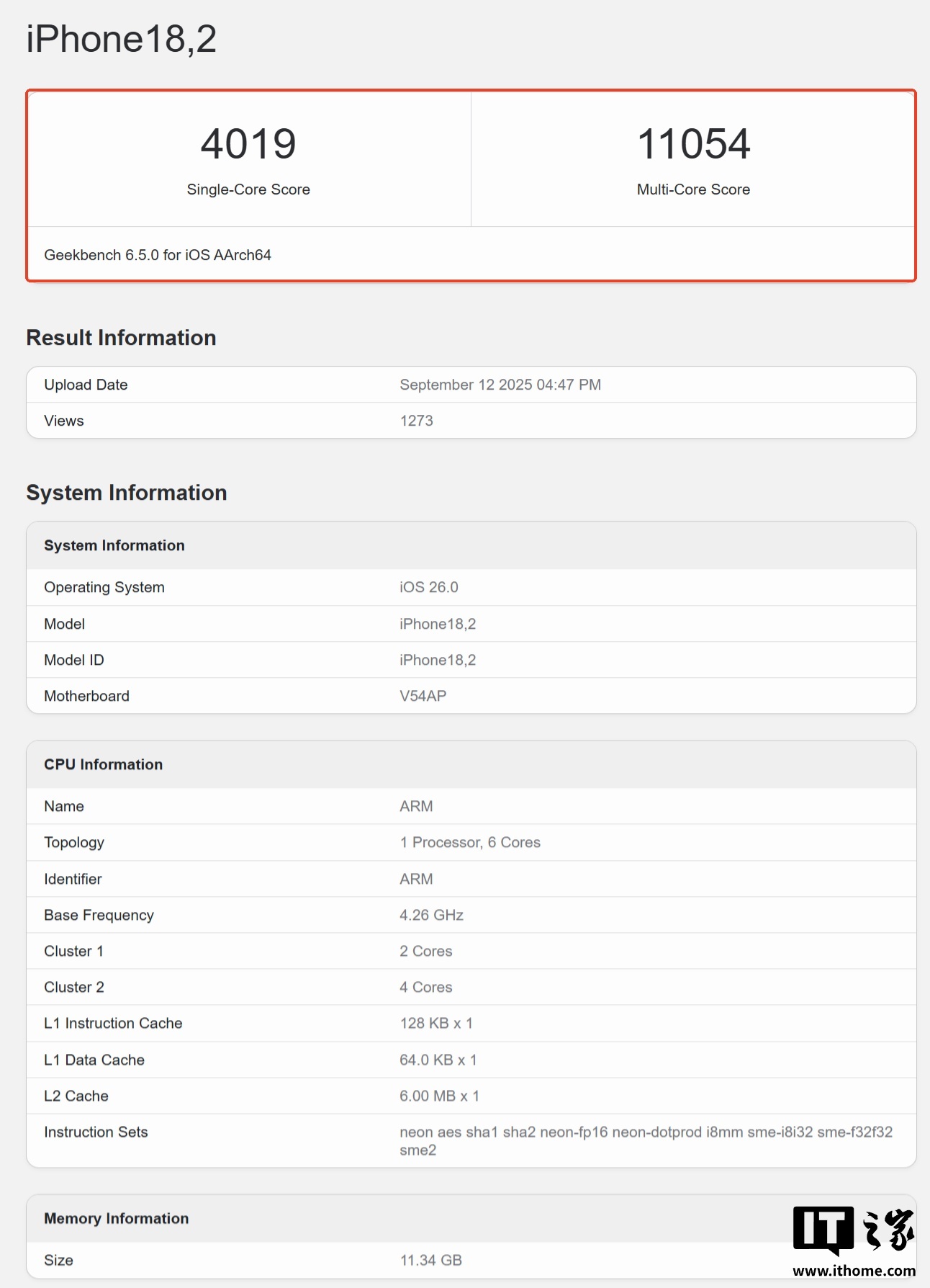 作为参考,苹果 A19 Pro 的单核成绩突破到 4019 分,多核成绩达到 11054 分。