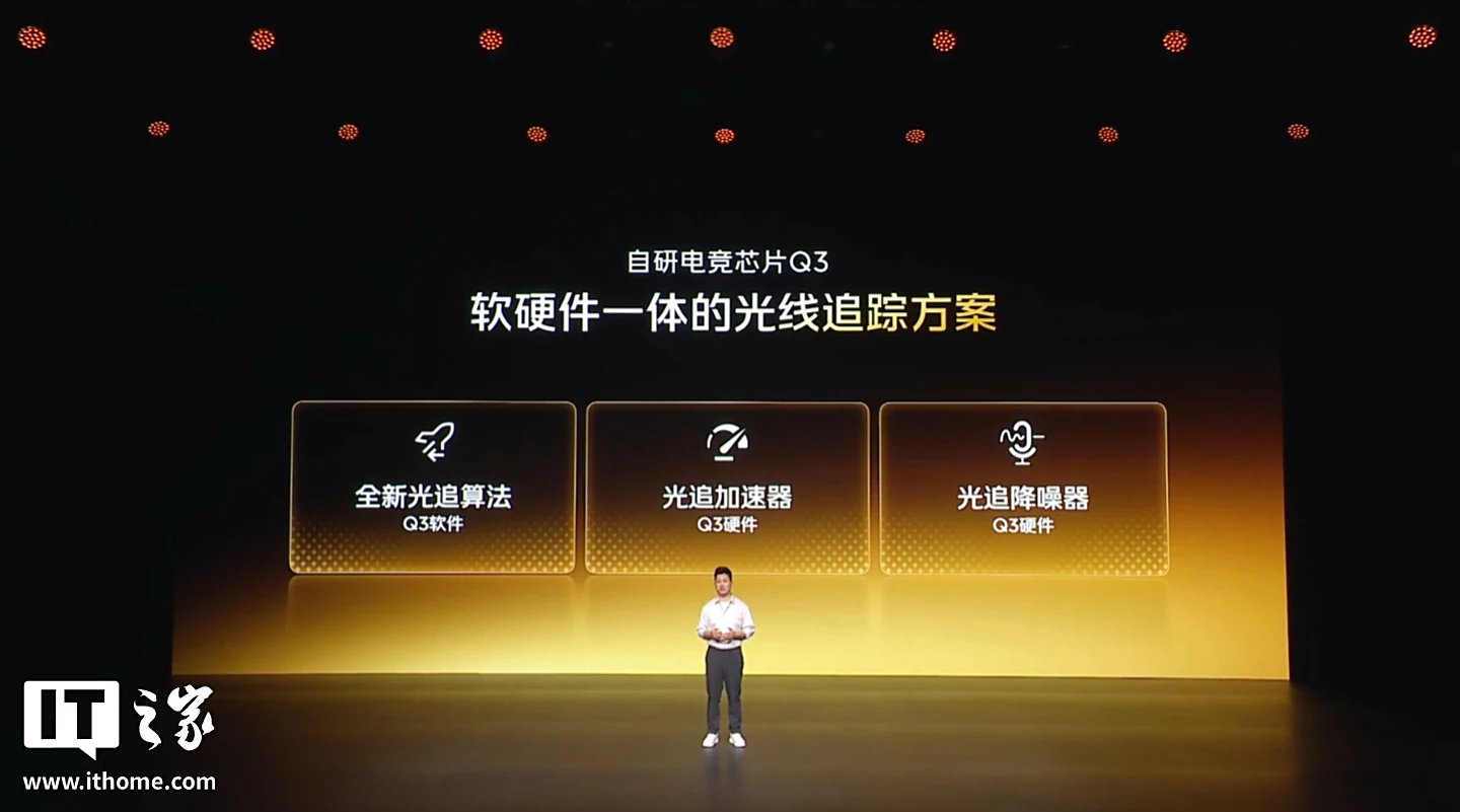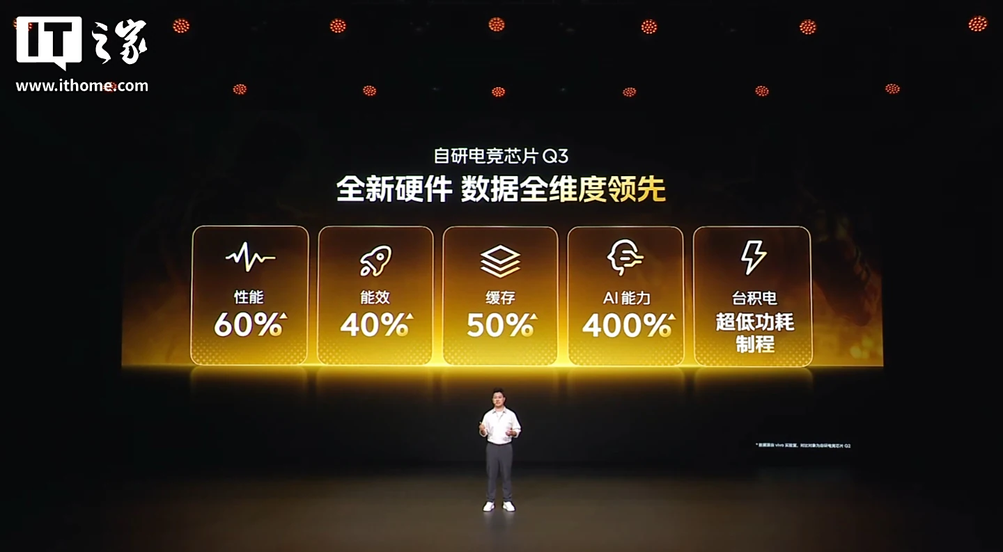 据介绍,iQOO 自研电竞芯片 Q3 采用台积电超低功耗制程,性能提升 60%、能效提升 40%、缓存提升 50%、AI 能力提升 400%。该芯片还行业唯一支持全场景光线追踪、超级分辨率、超级帧率。