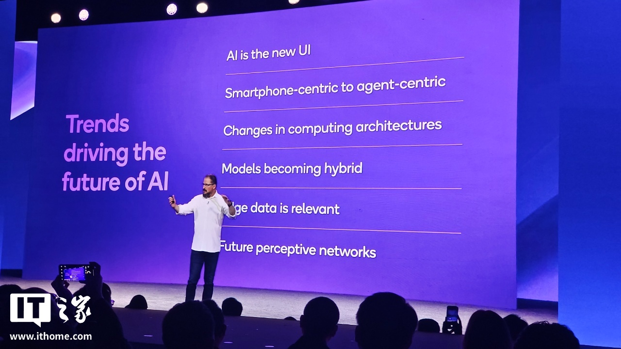 IT之家 9 月 24 日消息,在今天(北京时间 9 月 24 日)举办的骁龙峰会 2025 主题演讲中,高通首席执行官克里斯蒂亚诺・阿蒙(Cristiano Amon)上台演讲,展望“AI Everywhere”愿景,提出了“AI 是新 UI”的全新设计理念,围绕着 AI 打造全新生态。