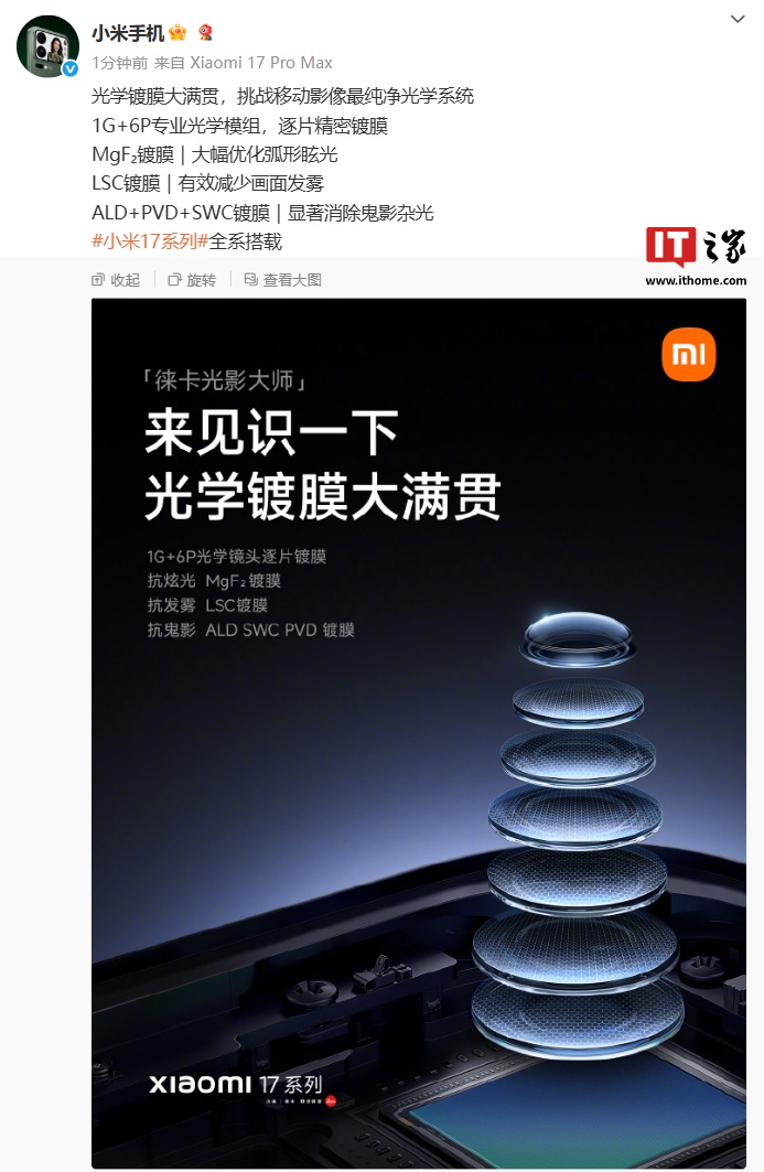 小米 17 系列手机全系搭载“光学镀膜大满贯”,挑战移动影像最纯净光学系统