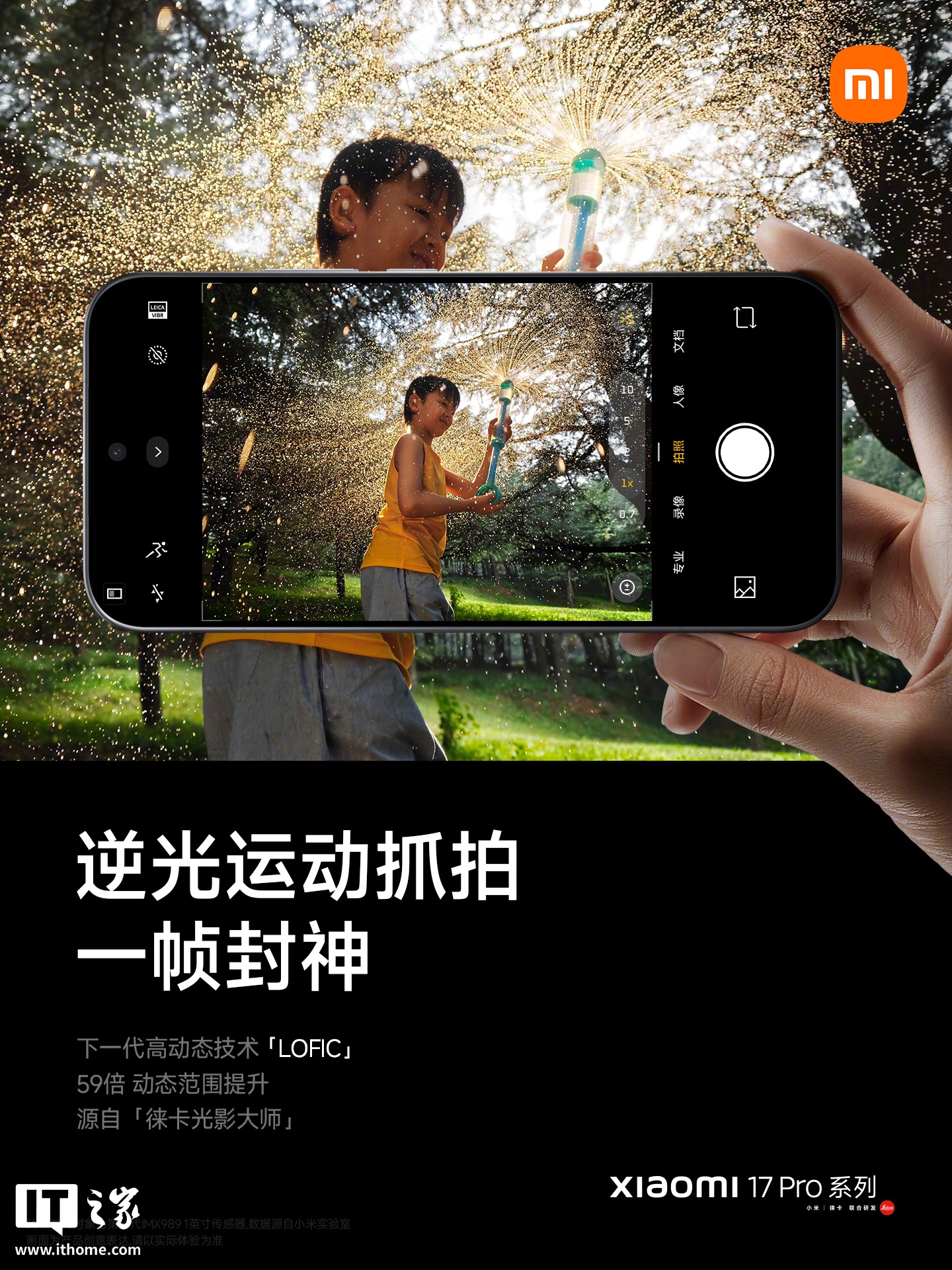 据IT之家今日早些时候报道,小米 17 Pro 系列率先攻克逆光摄影难题,搭载移动影像第三代高动态技术 LOFIC,单帧影像即可获得高动态 HDR,实现小米迄今最高传感器动态范围 16.5EV。另外,拍照、视频、预览皆可支持该效果,号称“让逆光运动抓拍,从此也封神”。