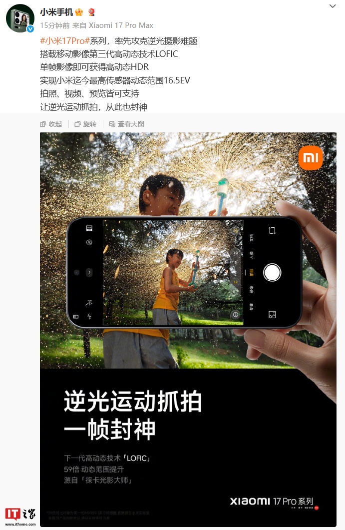 IT之家 9 月 24 日消息,小米手机官方今日宣布,小米 17 Pro 系列率先攻克逆光摄影难题,搭载移动影像第三代高动态技术 LOFIC,单帧影像即可获得高动态 HDR,实现小米迄今最高传感器动态范围 16.5EV。另外,拍照、视频、预览皆可支持该效果,号称“让逆光运动抓拍,从此也封神”。