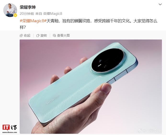 IT之家 9 月 25 日消息,荣耀终端股份有限公司旗舰手机产品经理李坤今日在微博分享了 Magic8 手机天青釉配色的外观。据介绍,该机采用直角边框设计,并点缀了独有的蝉翼纹路。值得一提的是,李坤的微博机型也已更换为荣耀 Magic8。