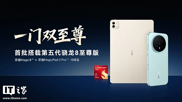 此外,荣耀手机今日宣布,荣耀 Magic8 系列手机与 MagicPad 3 Pro 平板首批搭载第五代骁龙 8 至尊版移动平台,号称“一门双至尊”。