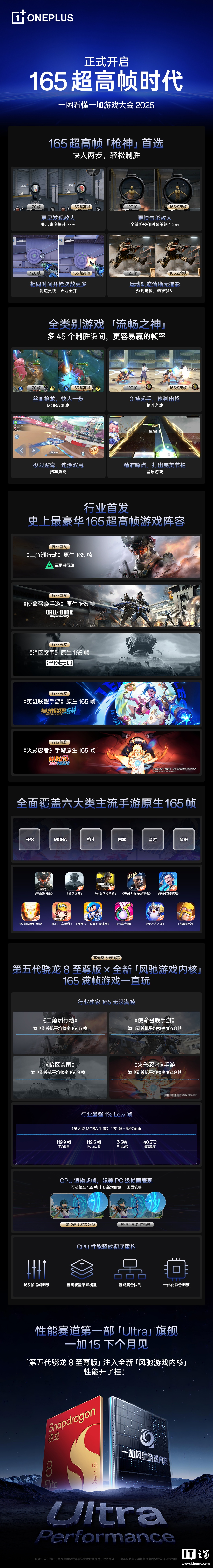 IT之家 9 月 26 日消息,在今日举行的“一加游戏大会 2025”上,一加 15 真机亮相。一加手机官方宣布,一加 15 搭载第五代骁龙 8 至尊版移动平台,首发 165 超高帧游戏生态。