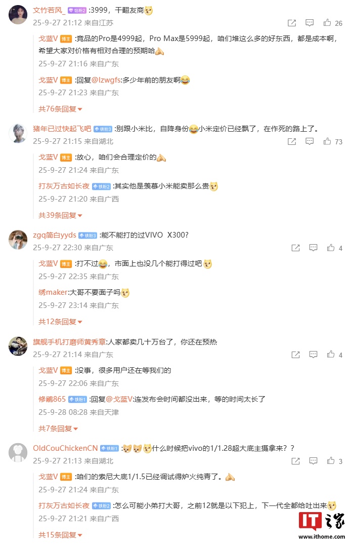 iQOO 产品经理 @戈蓝V 还在微博评论区透露了部分新品信息:针对新机的价格,他表示“竞品的 Pro 是 4999 起,Pro Max 是 5999 起,咱们堆这么多的好东西,都是成本啊,希望大家对价格有相对合理的预期哈”;针对 iQOO 什么时候把 vivo 的 1/1.28 超大底主摄拿来?他回复“咱们的索尼大底 1/1.5 已经调试得炉火纯青了。”