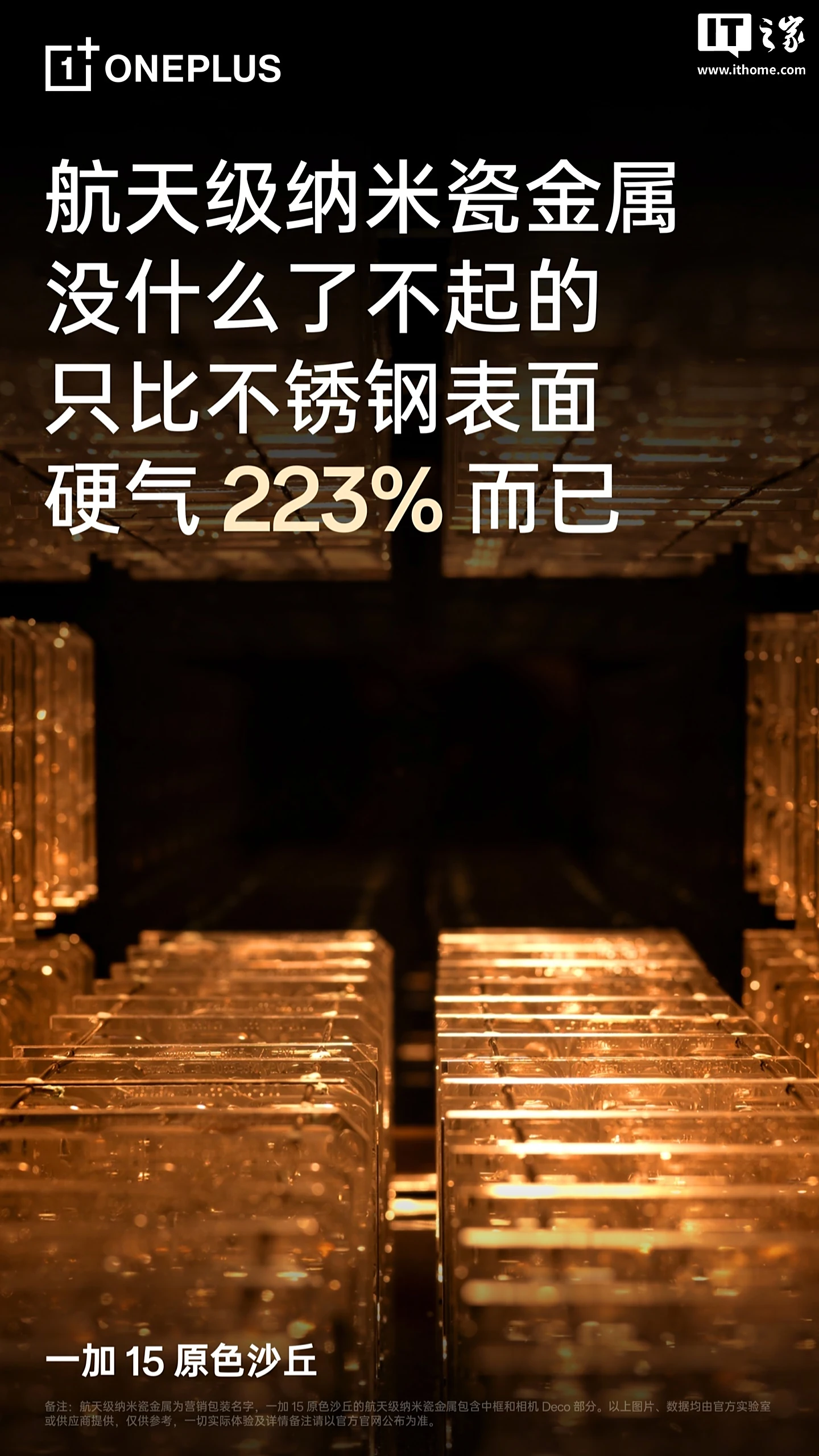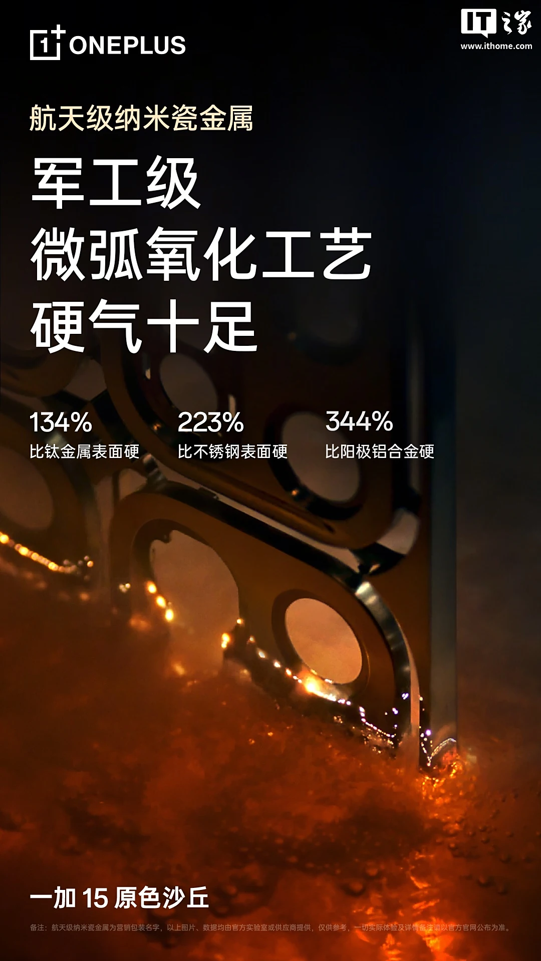 据IT之家今日早些时候报道,一加 15「原色沙丘」配色将首发「航天级纳米瓷金属」中框,带来全球领先的三大复杂工艺:军工级的微弧氧化工艺、独家自研的离子着色工艺、独家自研的纳米级封孔工艺,比钛金属更轻盈、更耐磨、散热更出色。